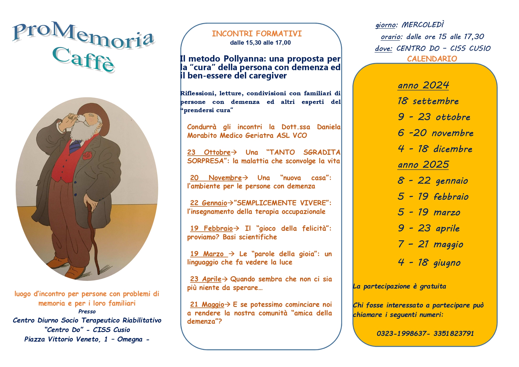Gli incontri si svolgono ogni due settimane al mercoledì pomeriggio dalle 15:00 alle 17:30. Ogni mese è previsto un incontro tematico dedicato ai caregiver e famigliari